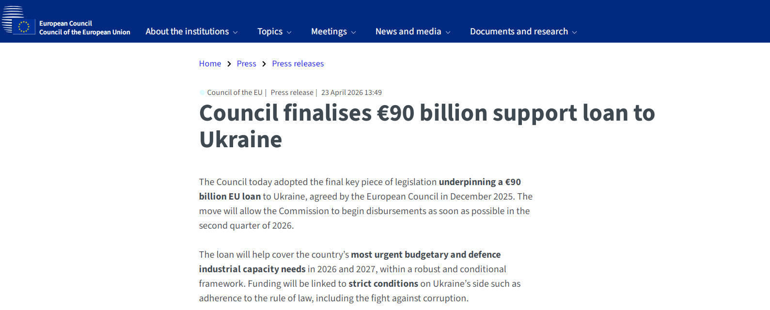 △4月23日,欧盟宣布对乌克兰提供900亿欧元贷款(图片来源:欧盟官网)